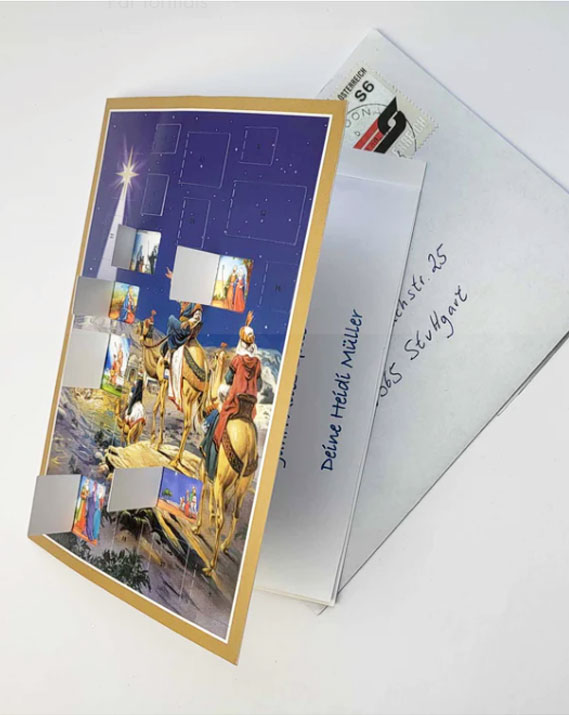 Très beau calendrier de l’Avent sous forme d’une carte postale avec ces petites fenêtres à ouvrir et à offrir à tout ceux qu’on aime.