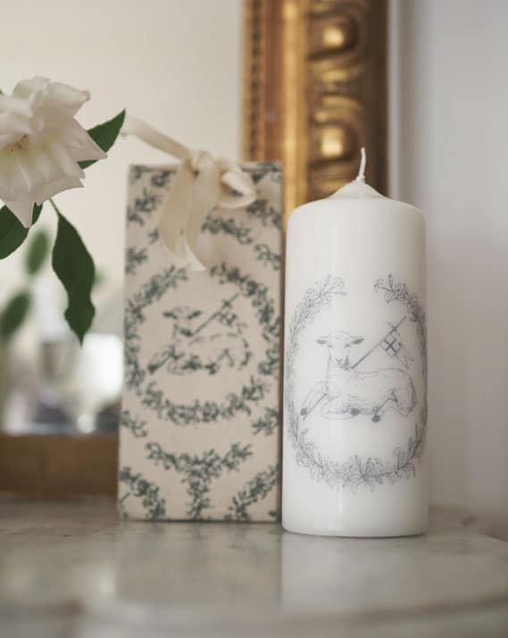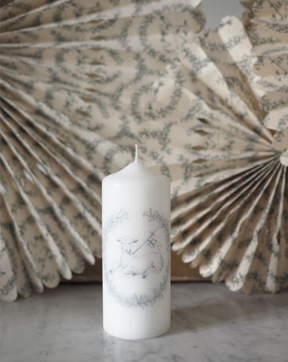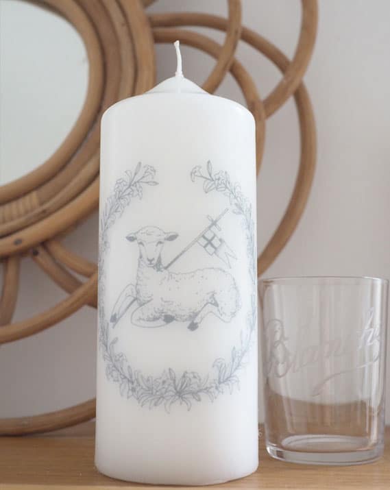 Ce cierge confectionné artisanalement avec soin est réalisé avec un agneau vainqueur entouré d’une couronne de fleur.  Ce cierge allumé dans le salon rappelle le cierge pascal allumé durant la Vigile de Pâques.