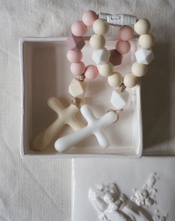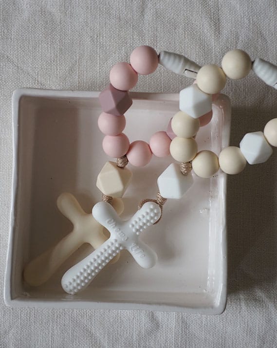 Un chapelet de dentition couleur crème. Parfait pour mettre bébé sous Divine Protection… jusqu’à ses quenottes !