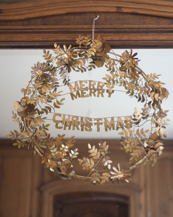 Jolie couronne de l’avent avec des feuilles dorées, dotée de l’inscription “Merry Christmas” , à suspendre devant sa porte d’entrée pour souhaiter de belles fêtes à ses invités, ou bien en décoration de Noël dans sa maison !