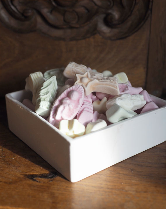 Fabriquées en France par une confiserie familiale, ces sujets de Noël couleur pastel fondent sur la langue pour le plaisir des papilles.