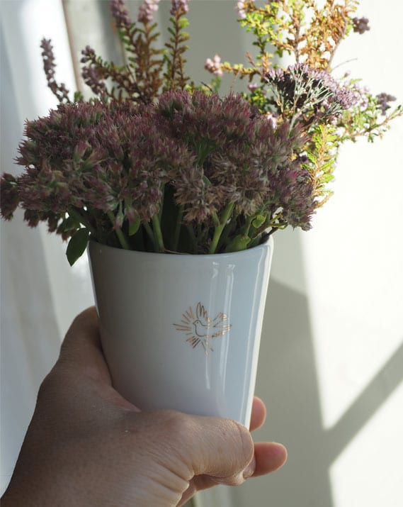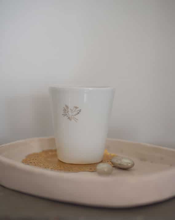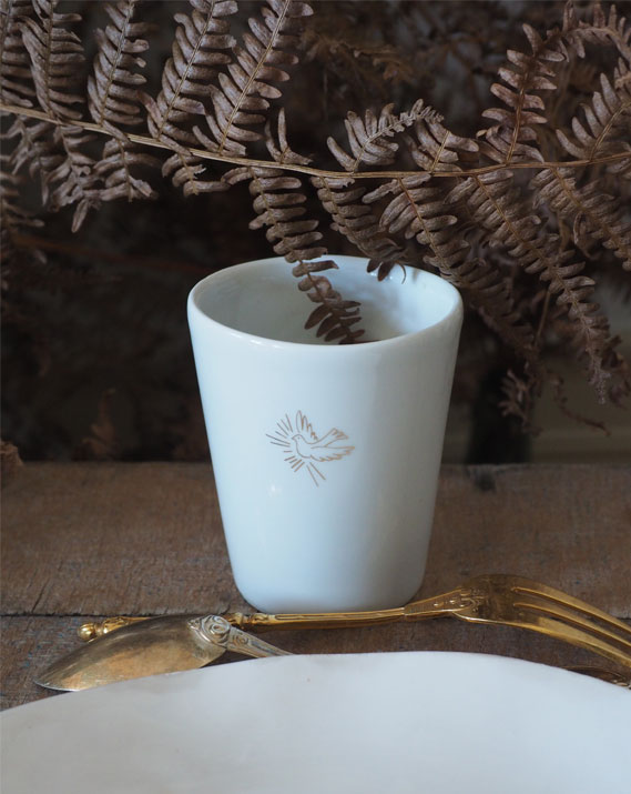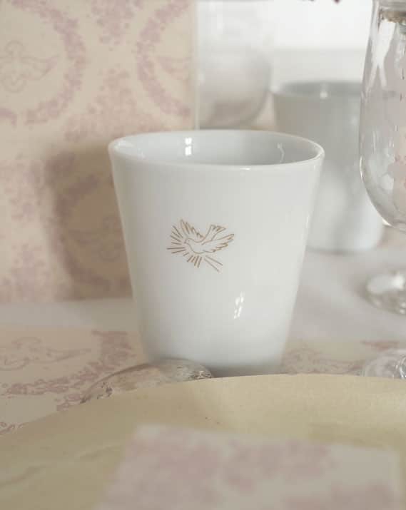 Ornée d’une ravissante colombe flamboyante, symbole de l’Esprit Saint, cette timbale en porcelaine blanche est une invitation au calme intérieur et à la prière…